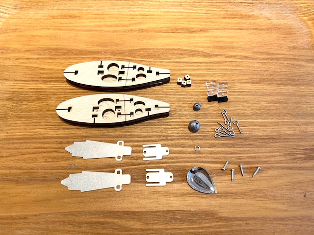 フラットサイドタイニークランクベイトキット L55mm w12mm セット内容・・ ボディa×1 ボディb×1 、台形リップ×1 、リップベース×1、スクリューアイキーパー×3、スクリューアイ×3 ウエイト×1、作り方説明書 よく釣れる55mmのスモールボディのフラットサイドクランク、誰でも簡単に本格的にルアー製作が楽しめるルアーキットです。(コーティングと塗装は必要) またボディ内部のラトルルームに付属のラトルボールをいれるアレンジもオススメ。 ハイスピードリトリーブでもバランスを崩さず足元まで泳ぎきる設計です。