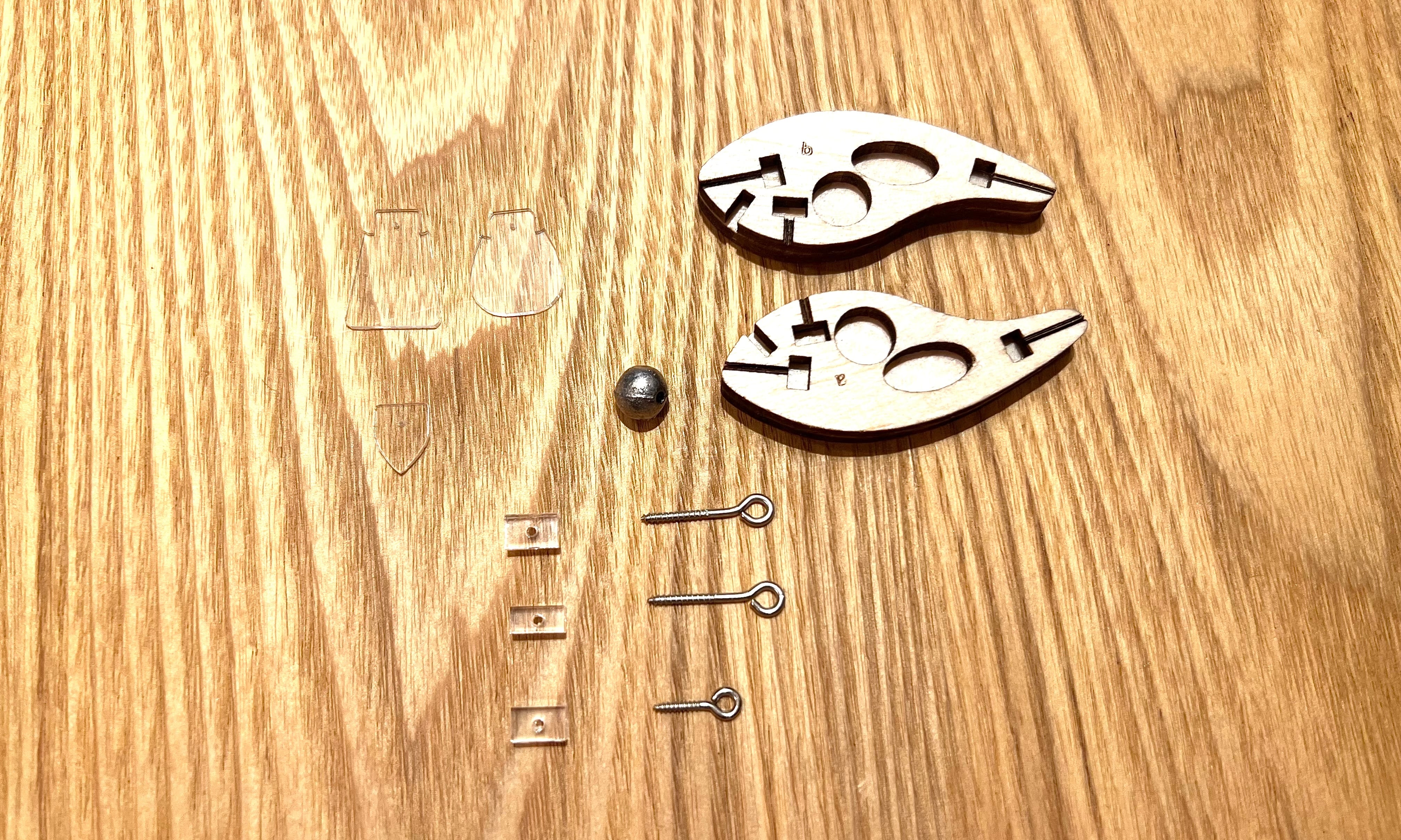 ボディa×1 ボディb×1 ラウンドリップ×1、台形リップ×1 、リップベース×1、スクリューアイキーパー×3、スクリューアイ×3 ウエイト×1、作り方説明書